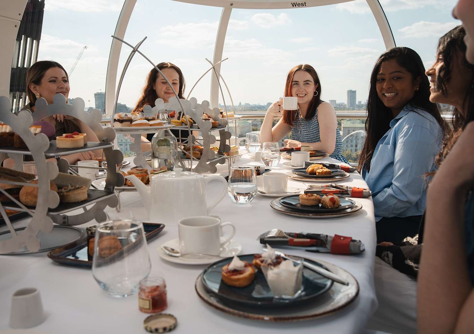 The bench in the centre of the pod had been replaced with a beautifully laid table adorned with sandwiches, scones and cakes neatly arranged on stands resembling the landmark itself (a nice touch).